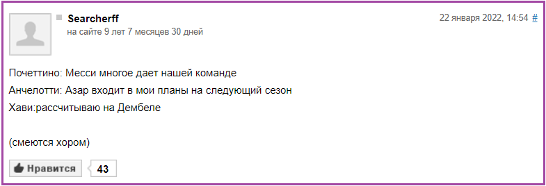 Уже традиционно мы продолжаем открывать новую неделю развлекательной рубрикой о лучших комментариях прошедших семи дней по мнению нашей редакции. Интересных событий в мире футбола за минувшую неделю было предостаточно, поэтому сразу хочется извиниться перед авторами других смешных комментариев, которые по определенным причинам не попали в сегодняшний обзор. Мониторинг всех ваших реакций на ту или иную новость, даже за такой незначительный период, занимает большое количество времени. Именно поэтому нет возможности увидеть все ваши комментарии. Желаем вам приятного чтения, прекрасного настроения и продуктивной недели!