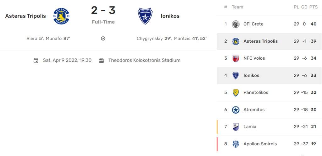У поєдинку групи виживання чемпіонату Греції Іонікос вирушив у гості до Астераса, де здобув перемогу у результативному матчі з рахунком 3:2.
