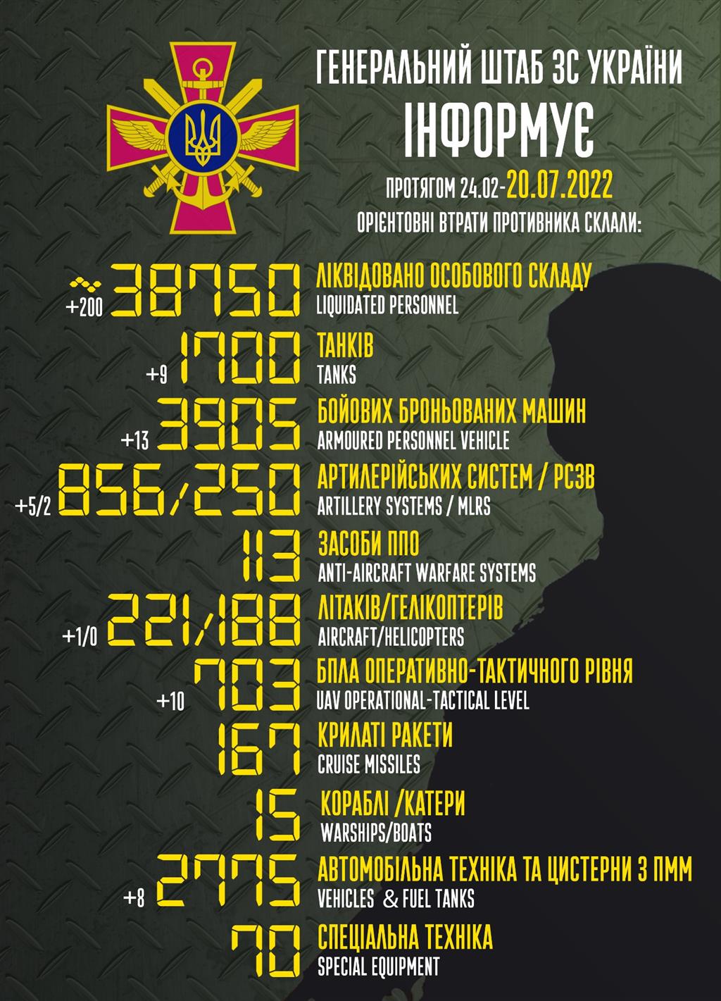 До вашої уваги інформація щодо російського вторгнення в Україну за підсумками 20 липня.