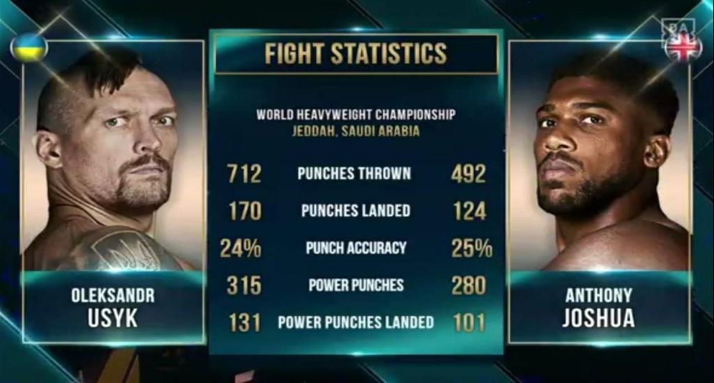 Таким чином, роздільним рішенням суддів Олександр зберіг чотири свої титули чемпіона світу в надважкій вазі, які він завоював в першому бою з Джошуа в Лондоні. Більш детальний огляд поєдинку читайте на ISPORT.
