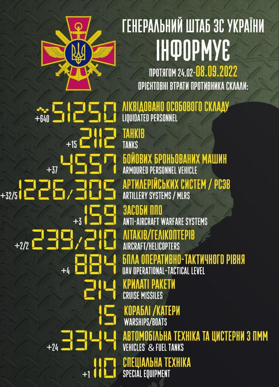 До вашої уваги інформація щодо російського вторгнення в Україну за підсумками 8 вересня.
