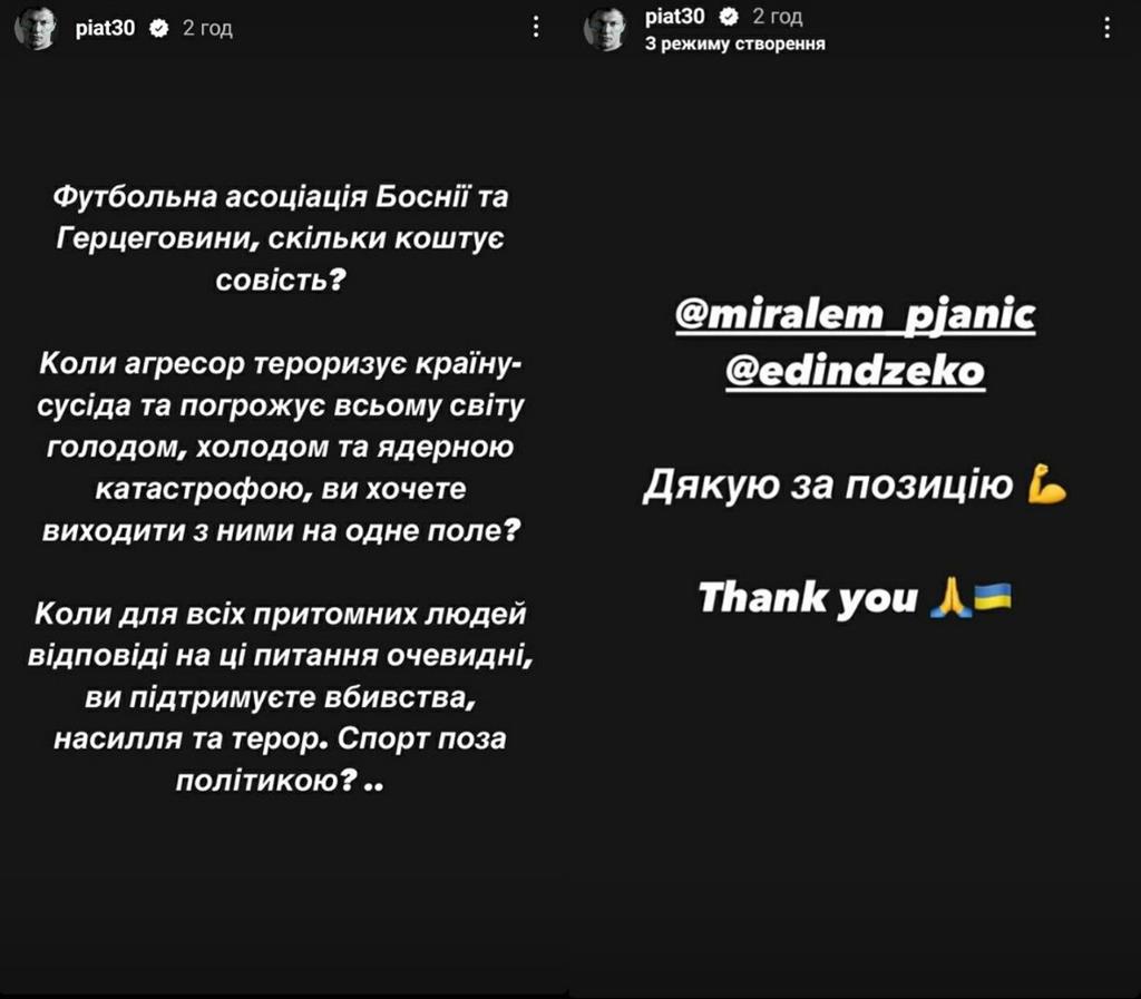 Дякую за позицію Міралему П’яничу та Едіну Джеко [які виступили проти проведення цього матчу]", — написав Пятов в своєму Instagram.