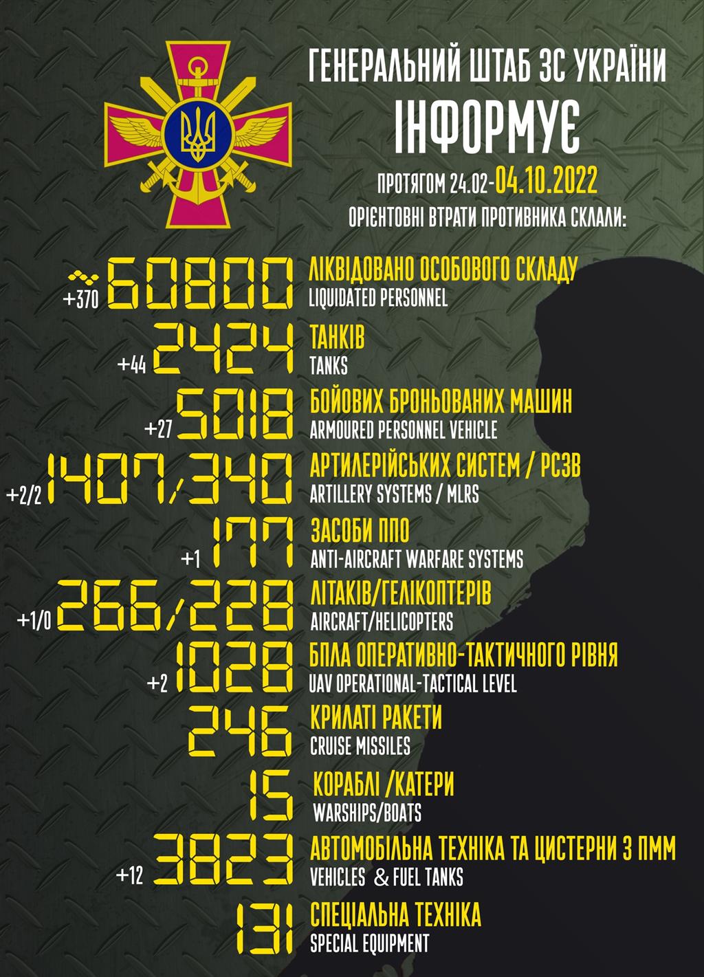 До вашої уваги інформація щодо російського вторгнення в Україну за підсумками 4 жовтня.