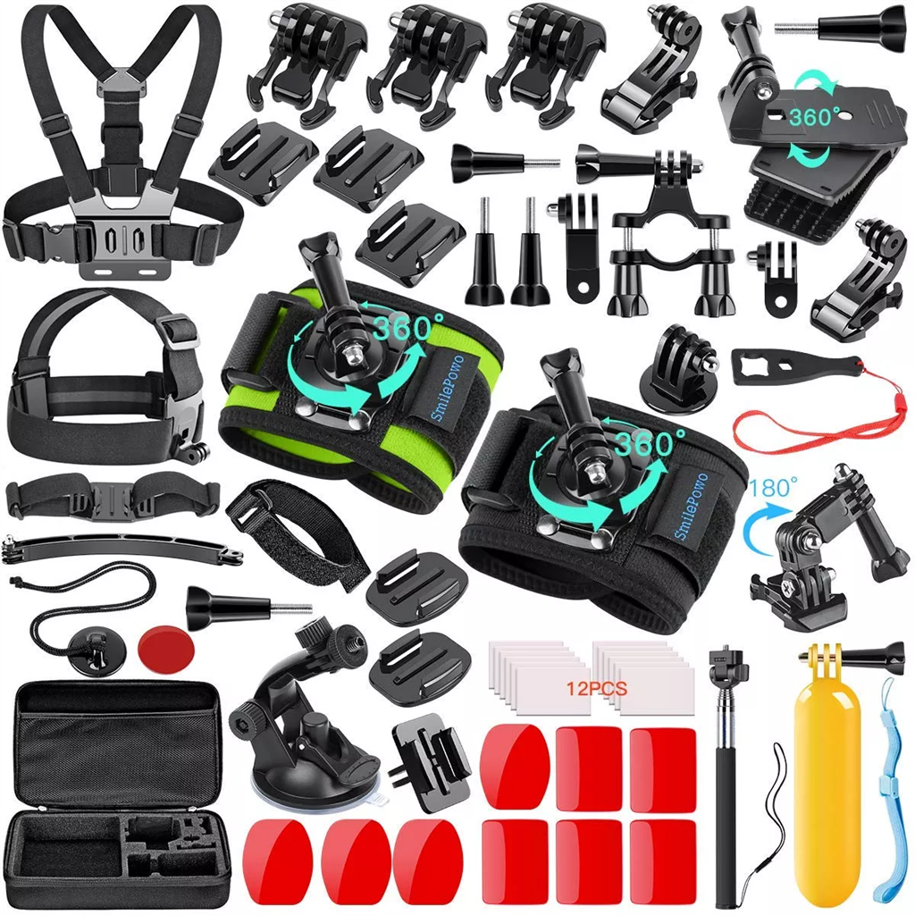 Якщо ви тільки починаєте і не впевнені, яке обладнання краще для вас, ми рекомендуємо спробувати їх за допомогою комплекту SmilePowo 51-в-1. Цей набір включає пристойну різноманітність кріплень, ремінців для зап'ясть, автомобільних присосок, палиць для селфі, гайкового ключа і навіть пінопластового футляра. Тут є безліч аксесуарів, і всі вони підходять для моделей GoPro Hero 3-GoPro Hero 8 Black.