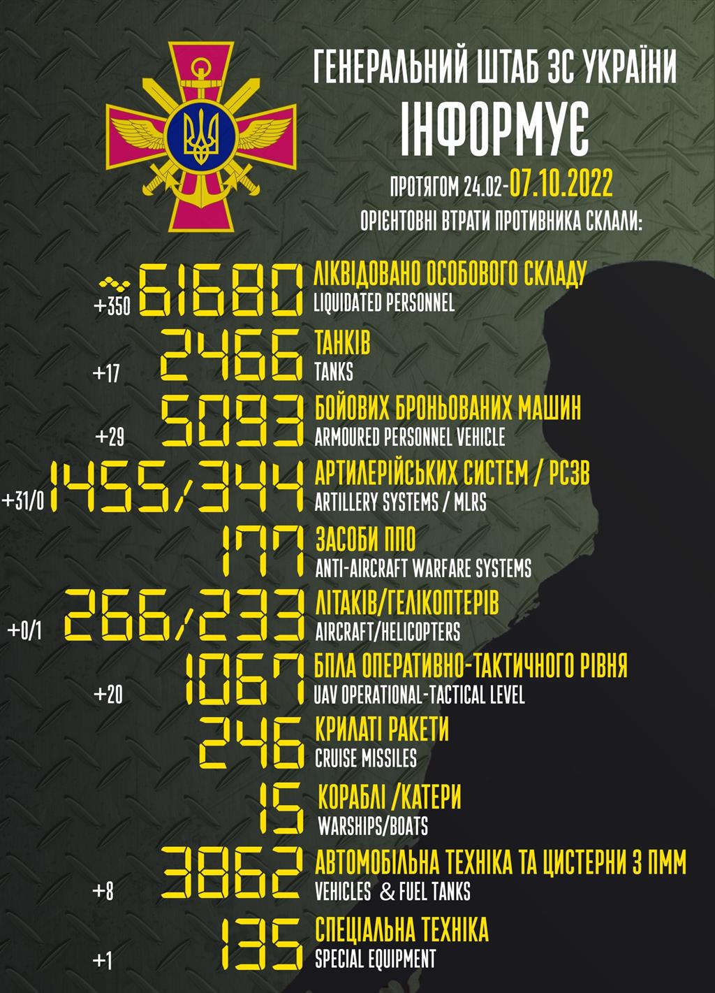 До вашої уваги інформація щодо російського вторгнення в Україну за підсумками 7 жовтня.