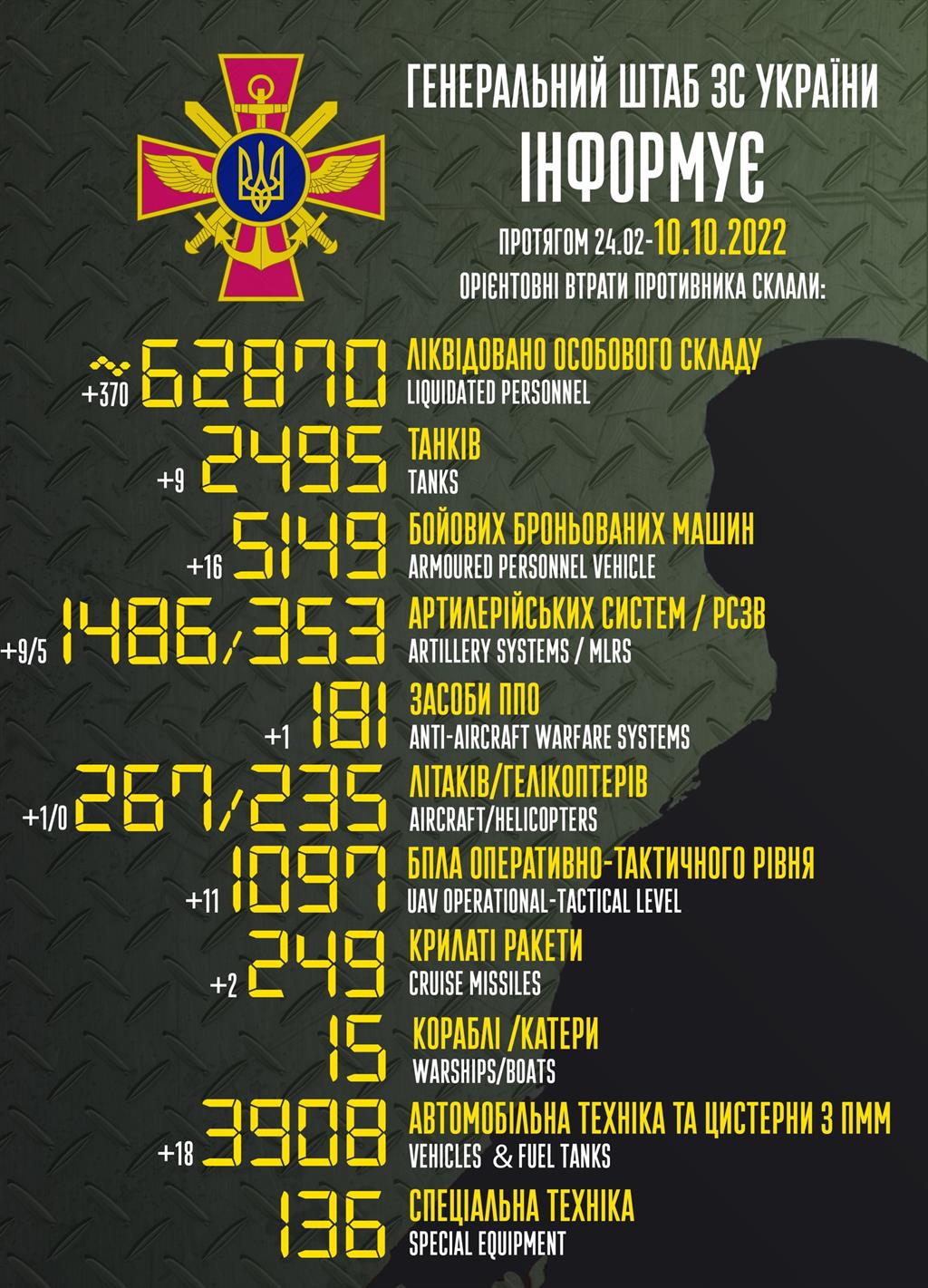 До вашої уваги інформація щодо російського вторгнення в Україну за підсумками 10 жовтня.