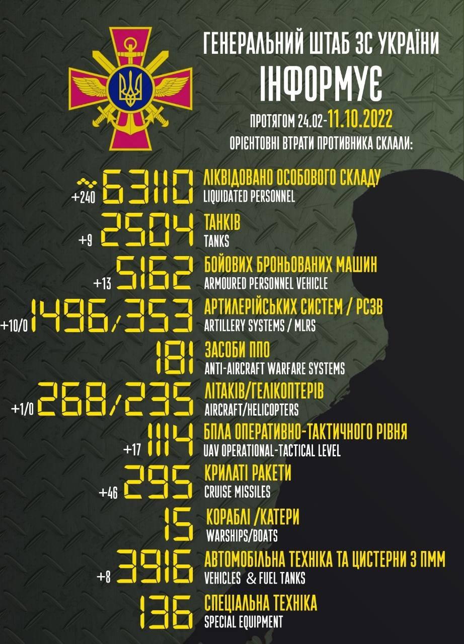 До вашої уваги інформація щодо російського вторгнення в Україну за підсумками 11 жовтня.