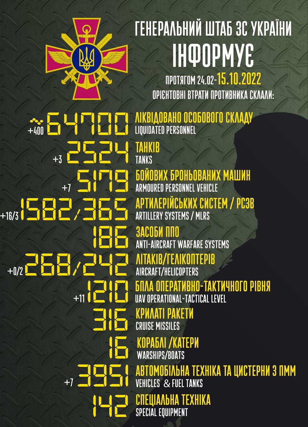 До вашої уваги інформація щодо російського вторгнення в Україну за підсумками 15 жовтня.