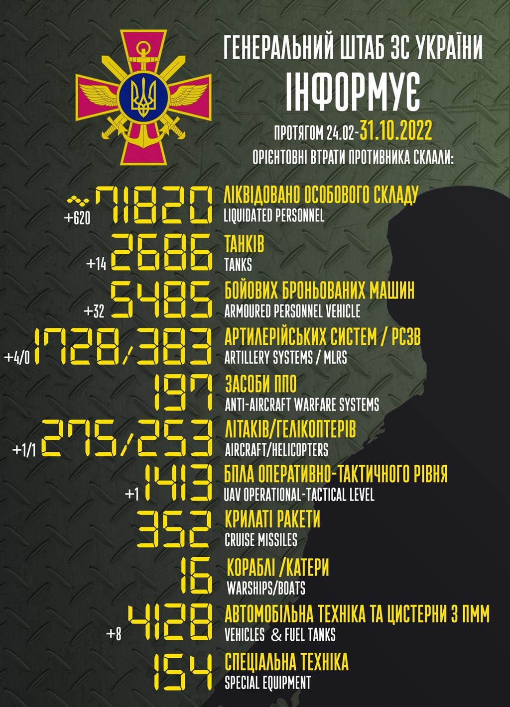 До вашої уваги інформація щодо російського вторгнення в Україну за підсумками 31 жовтня.