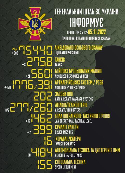 До вашої уваги інформація щодо російського вторгнення в Україну за підсумками 5 листопада.