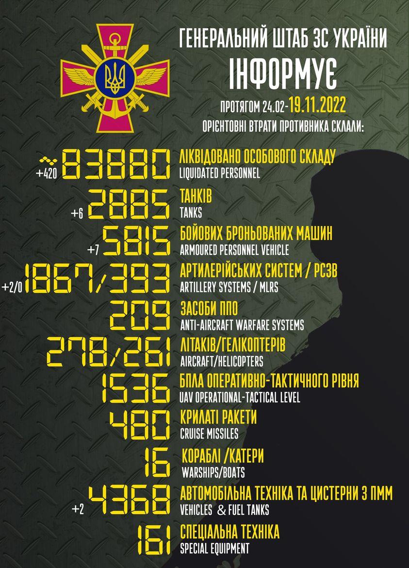 За уточненою інформацією, в результаті вогневого ураження Силами оборони району зосередження ворога поблизу Михайлівка Скадовського району Херсонської області, 17 листопада втрати загарбників склали близько 60 осіб загиблими.