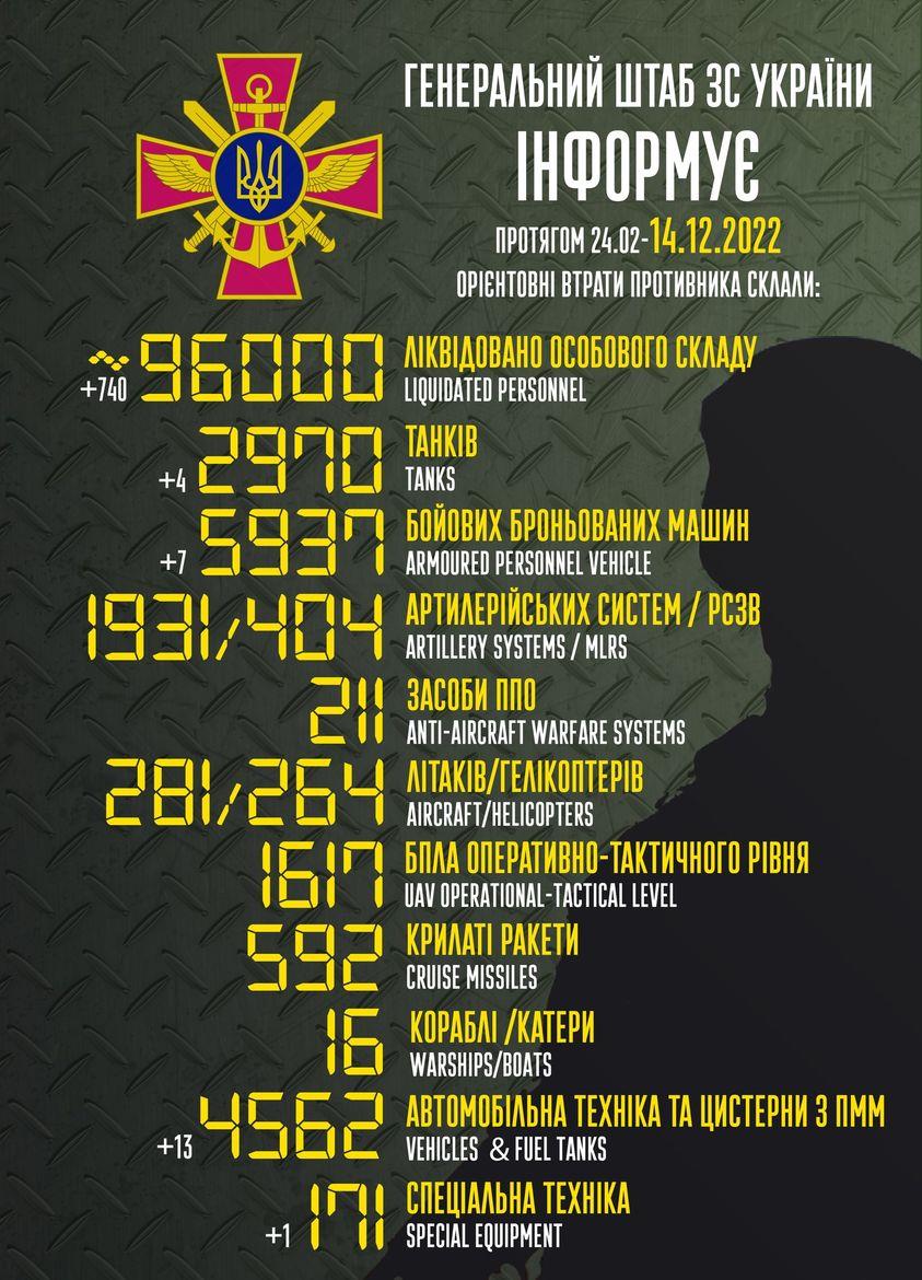 До вашої уваги інформація щодо російського вторгнення в Україну за підсумками 14 грудня.