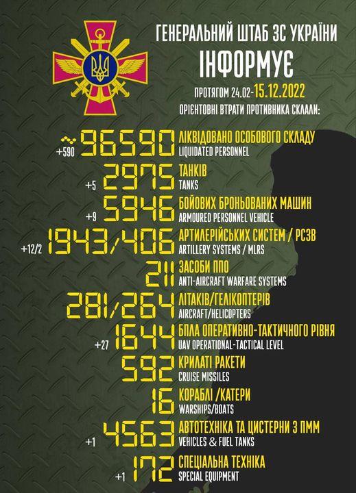 До вашої уваги інформація щодо російського вторгнення в Україну за підсумками 15 грудня.