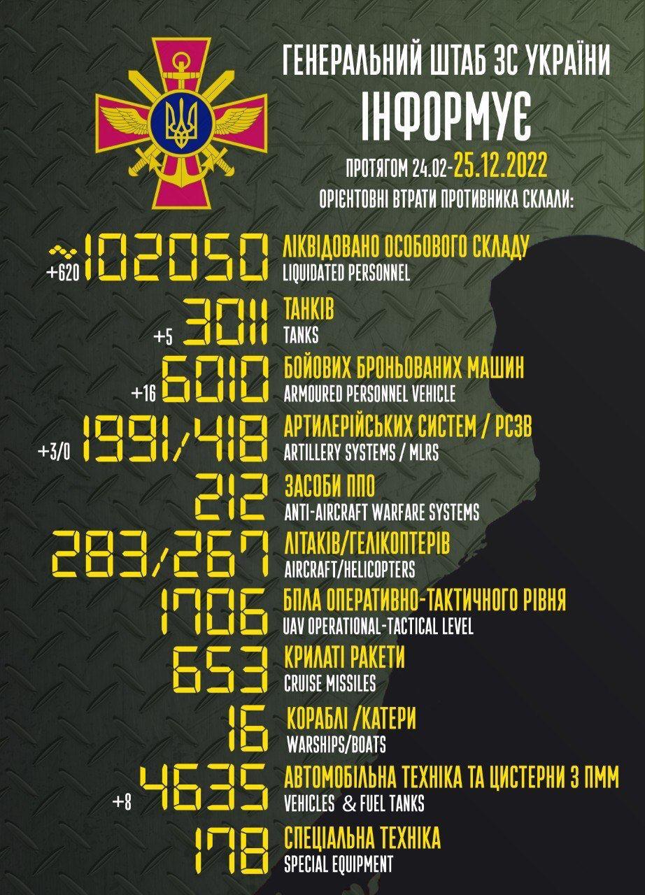 До вашої уваги інформація щодо російського вторгнення в Україну за підсумками 25 грудня.