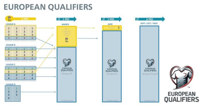 3) До груп з 5 команд потраплять збірні, які не будуть залучені у чвертьфіналах/стикових матчах Ліги націй. Вони почнуть свій відбір у березні, а інші стартують з червня.