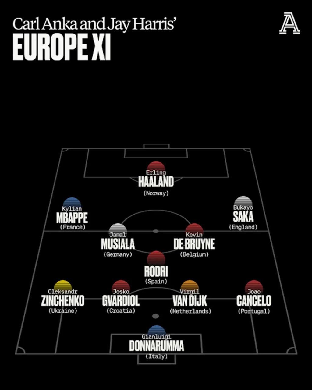 Склад збірної Європи: Доннарумма (Італія) — Канселу (Португалія), Ван Дейк (Нідерланди), Гвардіол (Хорватія), Зінченко (Україна) — Де Брюйне (Бельгія), Родрі (Іспанія), Мусіала (Німеччина) — Сака (Англія), Голанд (Норвегія), Мбаппе (Франція)