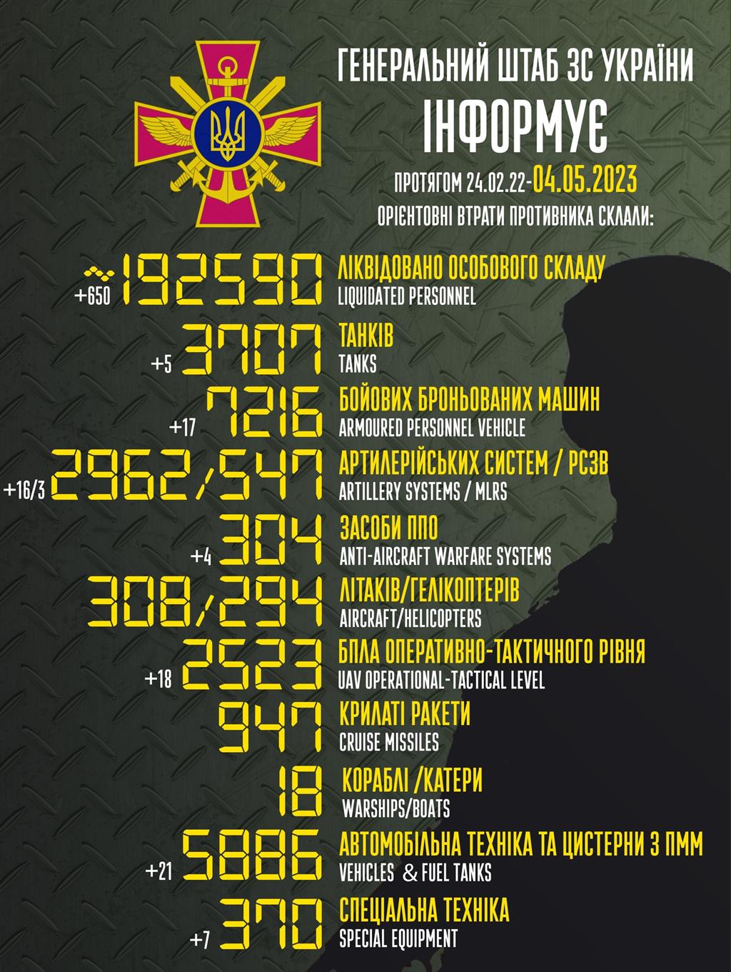 Загалом, минулої доби, наші захисники ліквідували 650 російських окупантів, знищили 5 танків, 17 бойових броньованих машин та 16 артилерійських систем. Окрім того, ворог втратив 3 реактивних системи залпового вогню, 4 засоби ППО, 21 автомобіль та 7 одиниць спеціальної техніки.