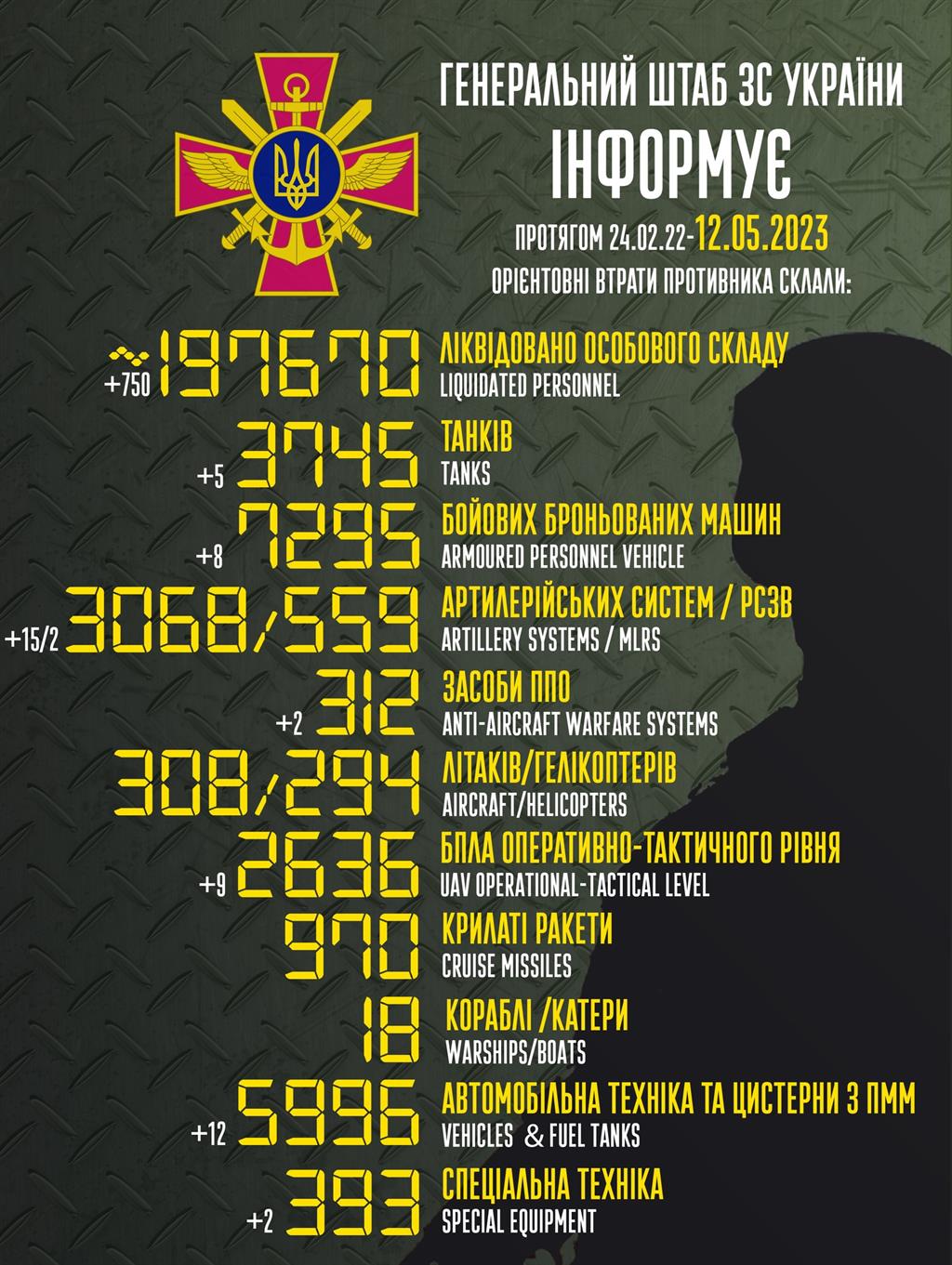 Загалом, минулої доби, наші захисники ліквідували 750 російських окупантів, знищили 5 танків, 8 бойових броньованих машин, 15 артилерійських систем, дві РСЗВ, 2 засоби ППО, 9 БпЛА оперативно-тактичного рівня, 12 автомобілів та 2 одиниці спеціальної техніки.
