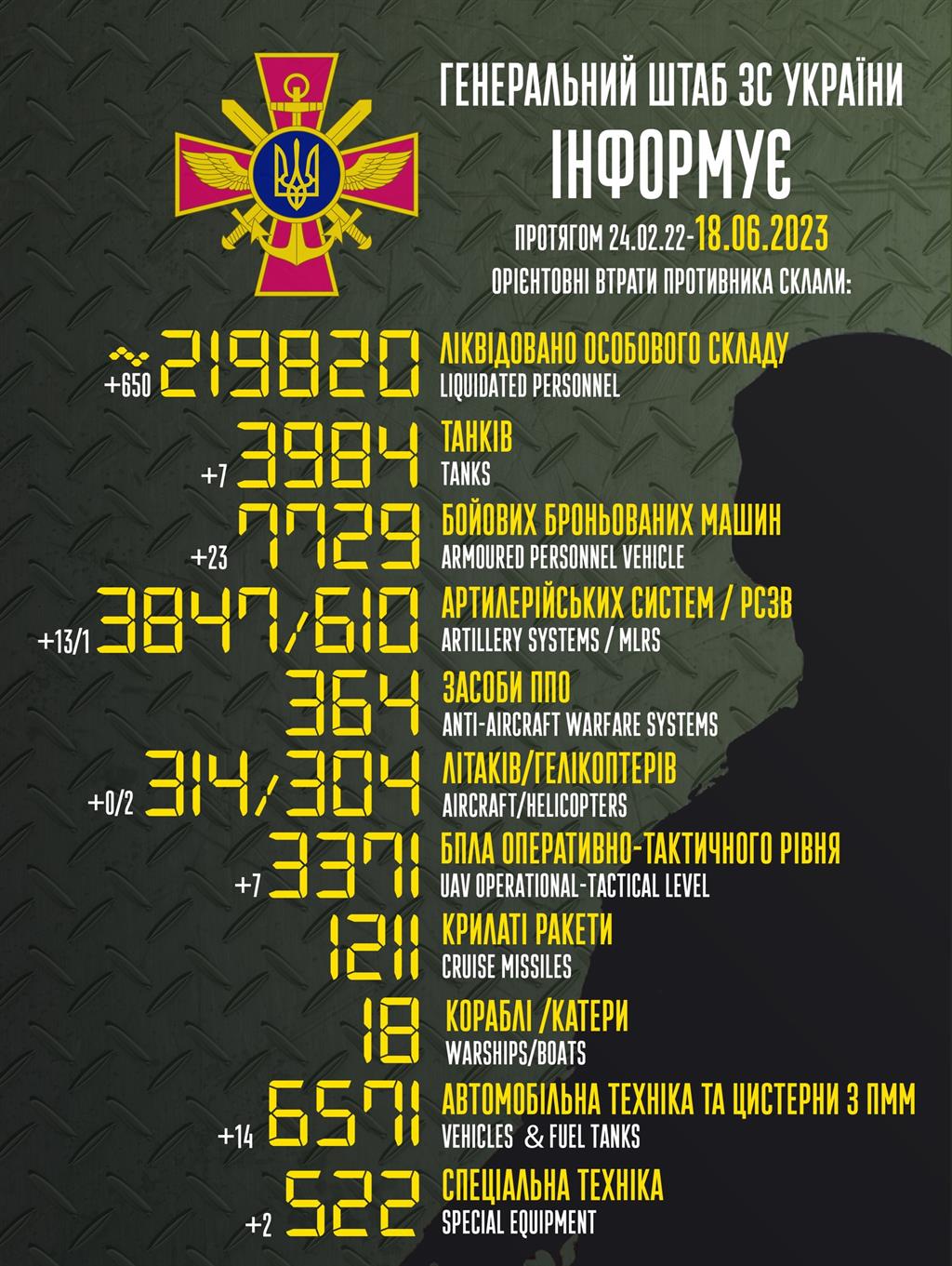 До вашої уваги інформація щодо російського вторгнення в Україну за підсумками 18 червня.