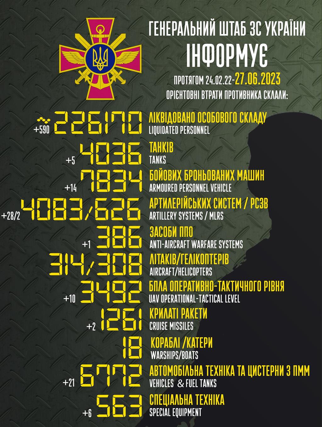 Загалом, минулої доби, наші воїни ліквідували 590 російських окупантів. Також ворог втратив 5 танків, 14 бойових броньованих машин, 28 артсистем, дві РСЗВ, один засіб ППО, 10 БПЛА оперативно-тактичного рівня, 21 автомобіль та 6 одиниць спеціальної техніки.