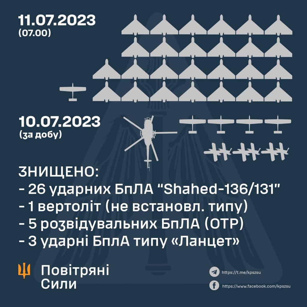 Протягом доби російські окупанти атакували Україну ударними безпілотниками іранського виробництва типу «Shahed». Усього було задіяно 28 дронів-камікадзе. В результаті успішної бойової роботи наша ППО знищила 26 ударних БпЛА та 2 розвідувальних безпілотники типу «Zala». Також, ворог завдав 54 авіаційних ударів та здійснив 38 обстрілів з реактивних систем залпового вогню по позиціях наших військ та населених пунктах. На жаль, окрім зруйнованої інфраструктури, постраждали мирні люди.