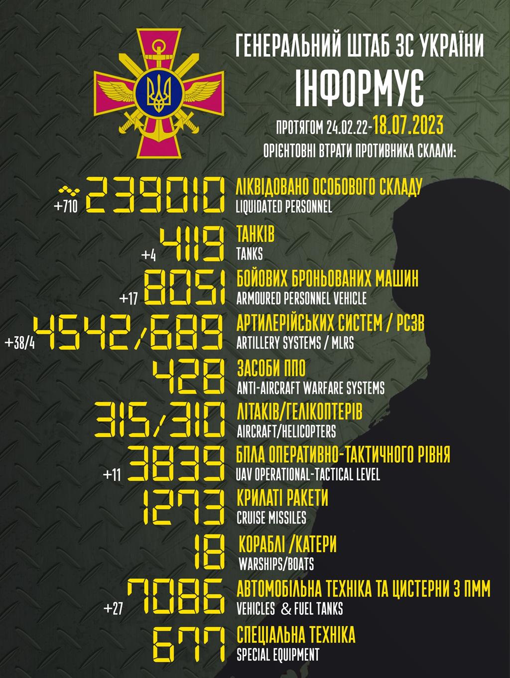 До вашої уваги інформація щодо російського вторгнення в Україну за підсумками 18 липня.