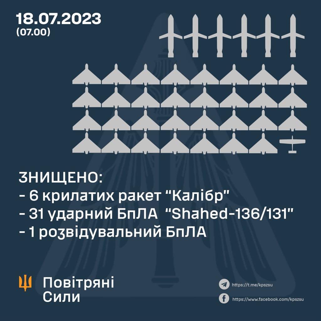 За уточненою інформацією, протягом доби, російські окупанти завдали ракетно-авіаційного удару по території України, застосувавши 6 крилатих ракет “Калібр” та 35 іранських ударних БпЛА “Шахед-136”. Силами та засобами Повітряних Сил знищено 6 крилатих ракет “Калібр” та 31 ударний БпЛА противника типу “Шахед-136”.