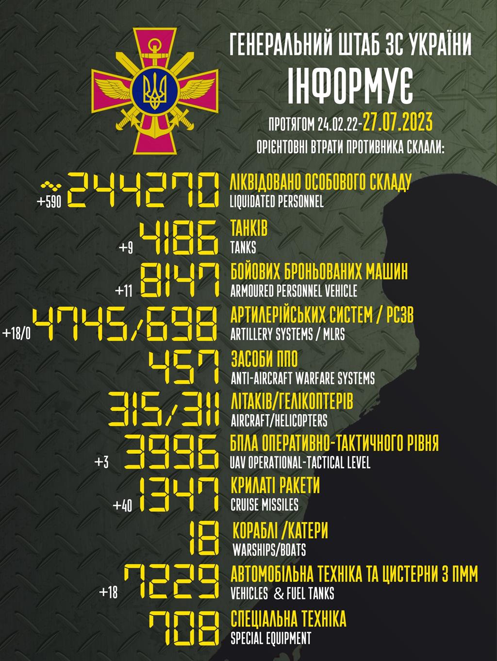 До вашої уваги інформація щодо російського вторгнення в Україну за підсумками 27 липня.