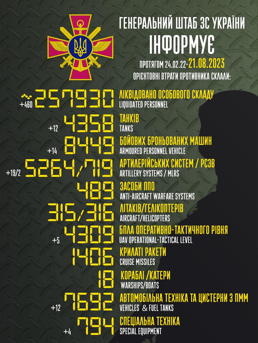 Загалом, минулої доби, українські воїни ліквідували 460 російських окупантів, знищили 12 танків, 14 бойових броньованих машин, 19 артилерійських системи, 2 РСЗВ, 5 БпЛА оперативно-тактичного рівня, 12 автомобілів та 4 одиниці спеціальної техніки.