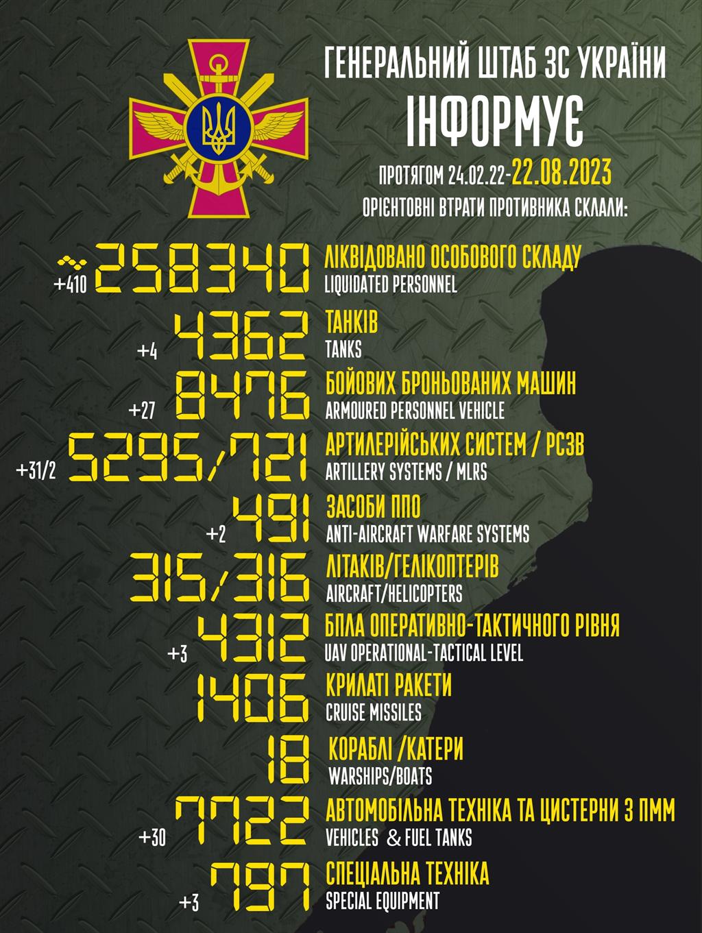До вашої уваги інформація щодо російського вторгнення в Україну за підсумками 22 серпня.
