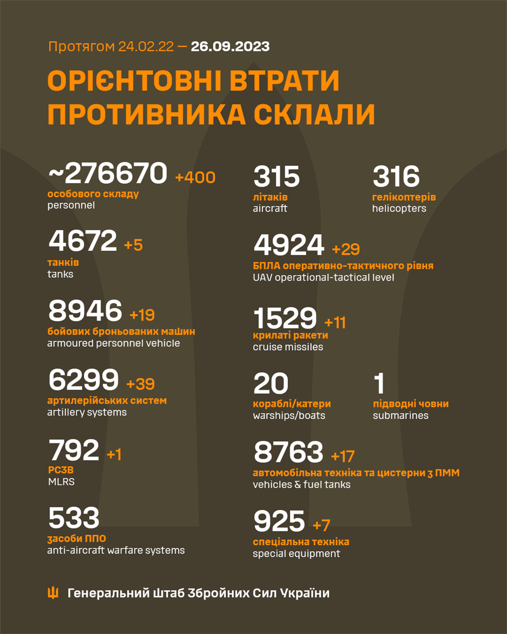 До вашої уваги інформація щодо російського вторгнення в Україну за підсумками 26 вересня 2023 року.