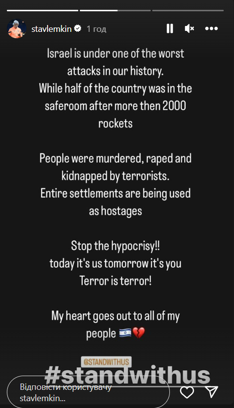 Люди вбиті, зґвалтовані та викрадені терористами. Цілі поселення перебувають у заручниках. Зупиніть лицемірство! Сьогодні ми, а завтра ви! Терор — це терор! Моє серце з усім моїм народом. Підтримайте нас", — написав Лемкін в своєму Instagram.