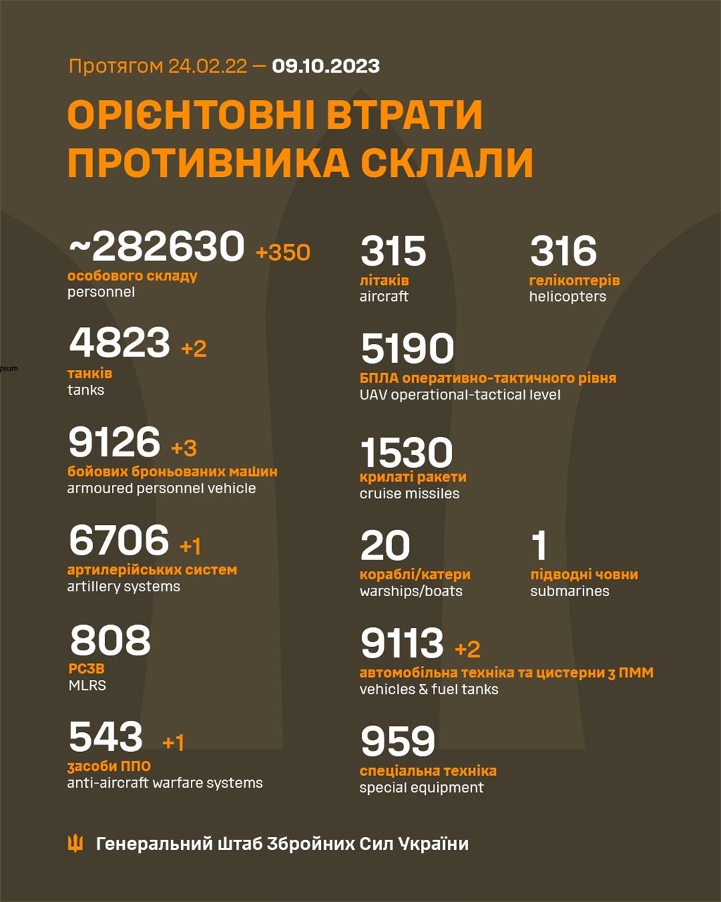 До вашої уваги інформація щодо російського вторгнення в Україну за підсумками 9 жовтня 2023 року.
