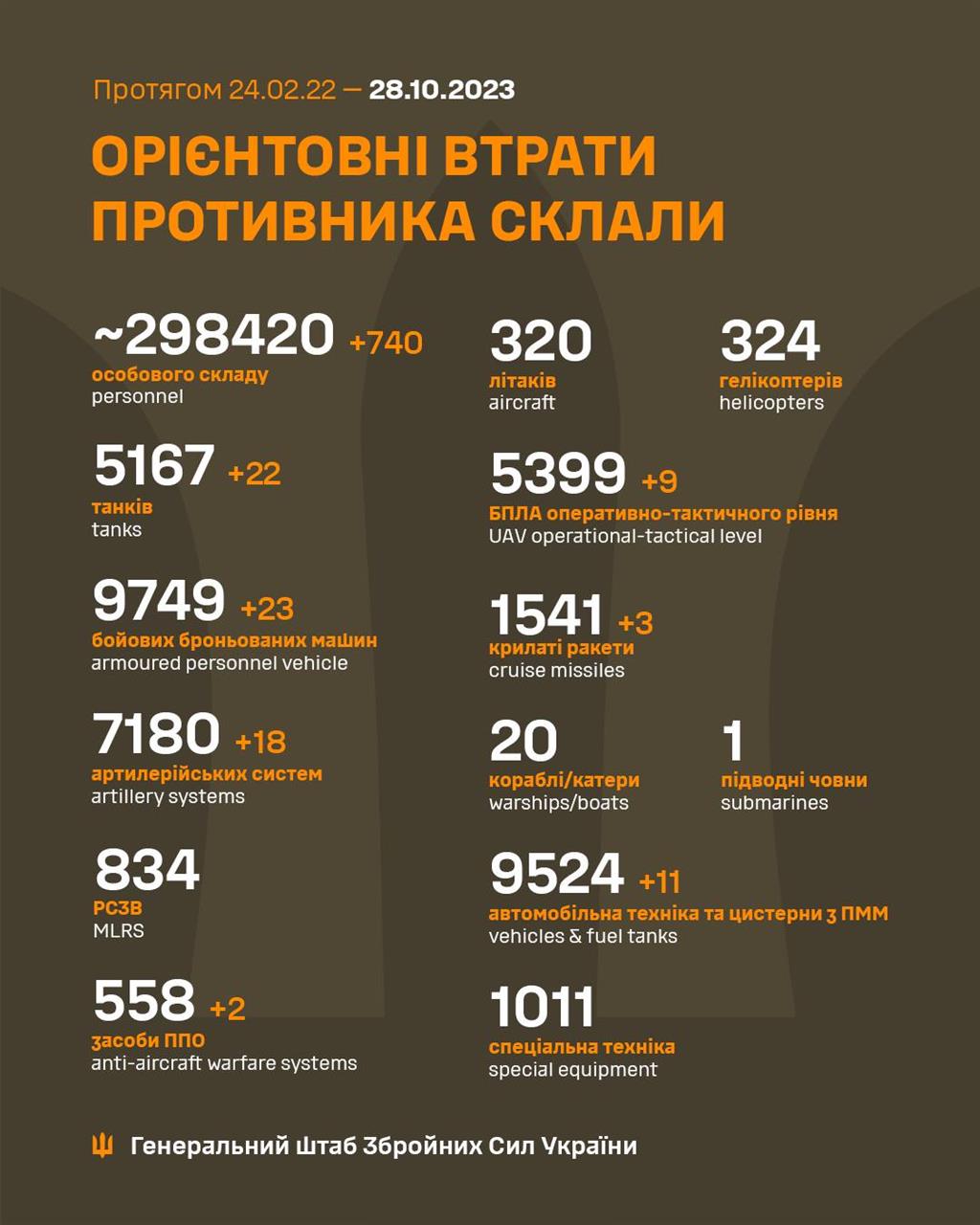 До вашої уваги інформація щодо російського вторгнення в Україну за підсумками 28 жовтня 2023 року.