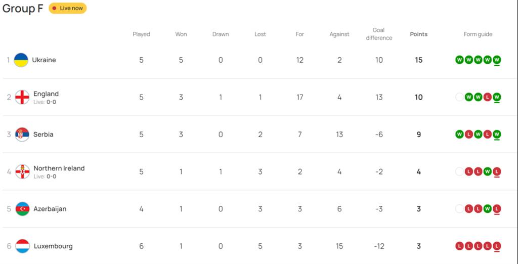 У паралельному поєдинку Сербія впоралася з Люксембургом (2:0), а о 21:45 за київським часом розпочалась зустріч Англії та Північної Ірландії. Турнірне положення у кваліфікаційній групі "синьо-жовтих" наразі наступне: