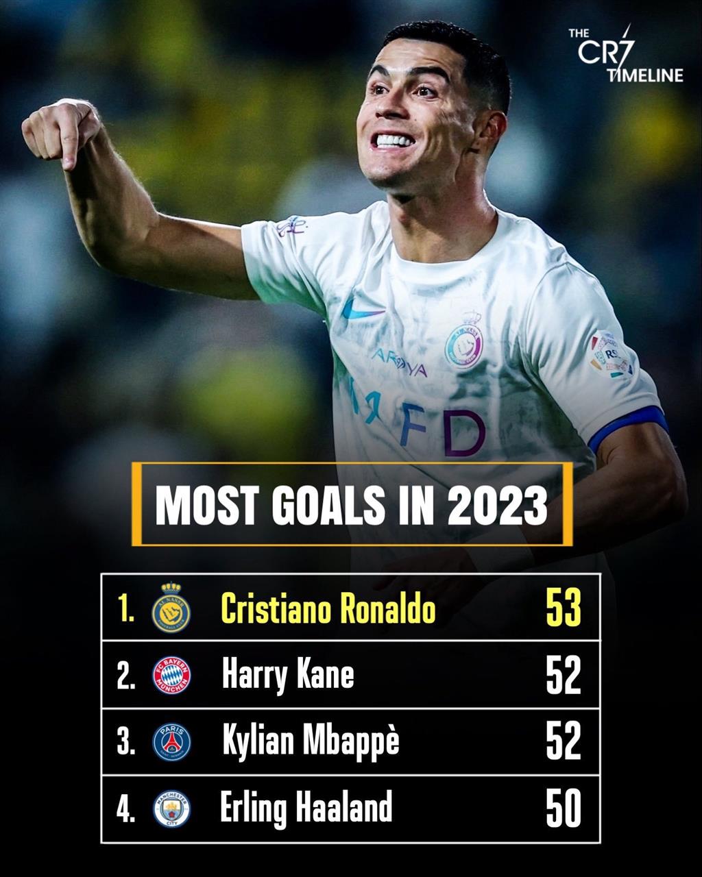Він випереджає Кіліана Мбаппе з Парі Сен-Жермен (52 голи, 53 матчі, 15 пенальті), Гаррі Кейна з мюнхенської Баварії (52 голи, 57 матчів, 11 пенальті) та Ерлінга Голанда з Манчестер Сіті (50 голів, 60 матчів, 15 пенальті).