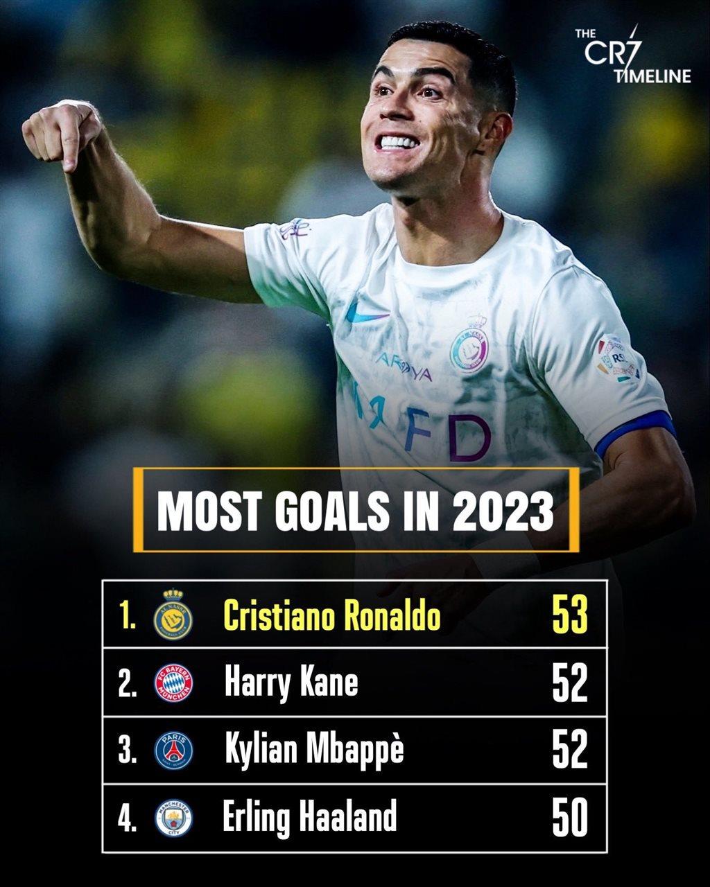 ☃️ Кріштіану Роналду очолив список найкращих бомбардирів у 2023 році завдяки дублю з пенальті у рамках 17 туру чемпіонату Саудівської Аравії проти Аль-Іттіхада (5:2). У підсумку португалець зберіг цей статус, випередивши Гаррі Кейна, Кіліана Мбаппе та Ерлінга Голанда.