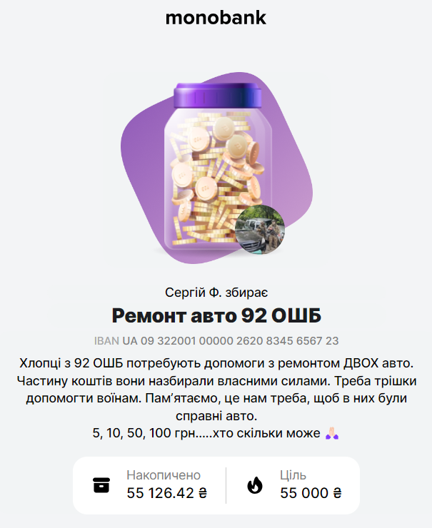 Хлопці власними силами назбирали 32 тисячі гривень з необхідних 87 тисяч. Тож їм треба допомогти зібрати ще 55 тис. грн. Просимо всіх небайдужих доєднатися до збору і разом наблизити перемогу над путінськими окупантами.