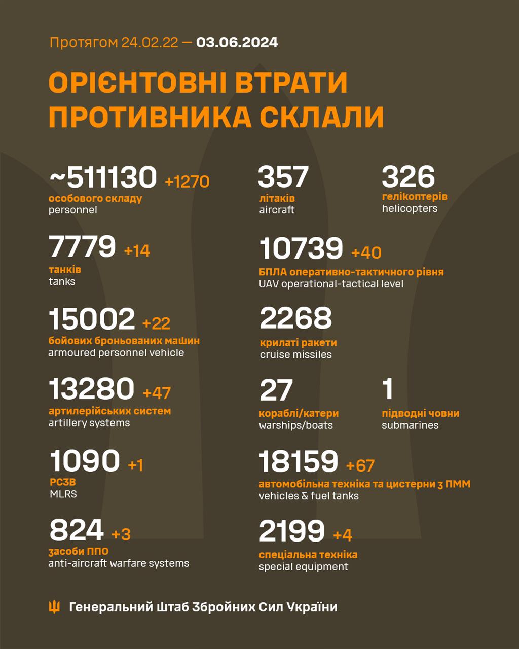 До вашої уваги інформація щодо повномасштабного російського вторгнення в Україну за підсумками 3 червня 2024 року.