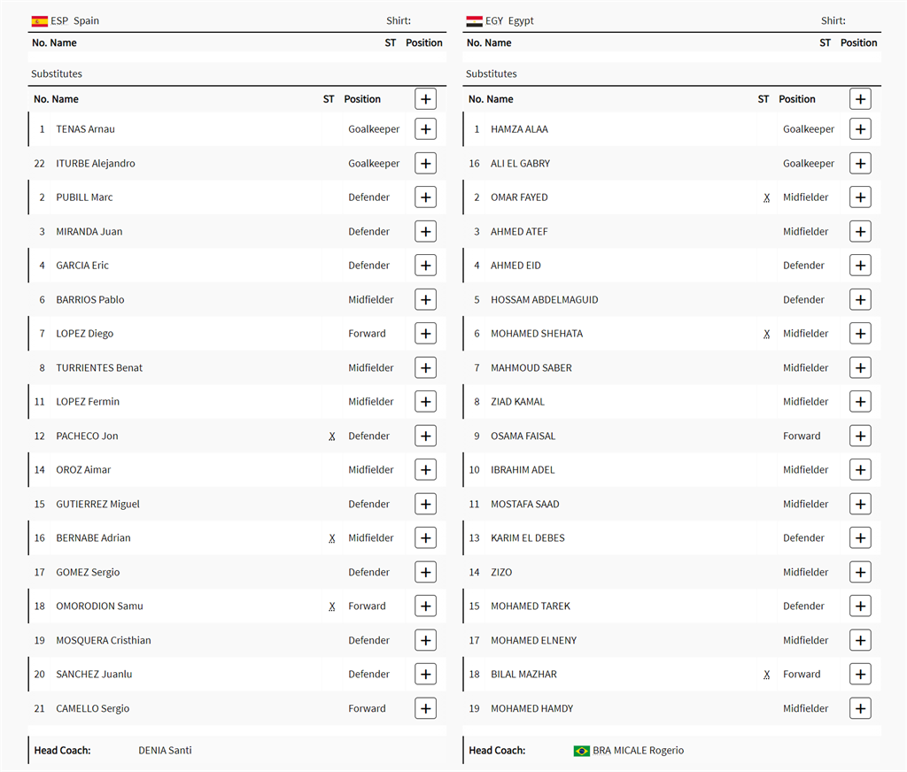 Питання виходу до плей-оф Іспанія для себе вже закрила. Залишилося тільки з'ясувати, яке місце групи С у підсумку їй дістанеться. На турнірі в Японії у 2021 році єгиптяни та іспанці не зуміли виявити сильнішого (0:0) в першому турі групового етапу. Саме Іспанія тоді фінішувала першою в квартеті С, де також опинилися Аргентина та Австралія, а Єгипет був другим.