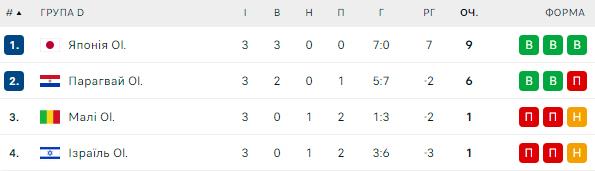 Таким чином, Японія посіла перше місце у групі D, набравши сім очок. Друге місце у Парагвая із шістьма балами. Ізраїль та Малі вилетіли з турніру.