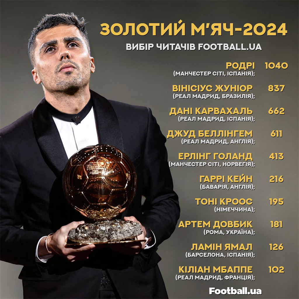 Отже, наші користувачі вважають, що півзахисник Манчестер Сіті та збірної Іспанії Родрі гідний сьогодні отримати Золотий м'яч.