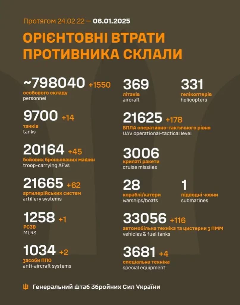 До вашої уваги інформація щодо повномасштабного російського вторгнення в Україну за підсумками 6 січня 2025 року.
