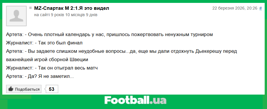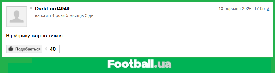 P. S. Цікавих подій у світі футболу за минулий тиждень було достатньо, тому вкотре хочеться перепросити авторів інших смішних коментарів, які з певних причин не потрапили в сьогоднішній огляд. Моніторинг всіх ваших реакцій на ту чи іншу новину, навіть за такий незначний період, займає багато часу. Саме тому немає можливості побачити усі ваші коментарі.