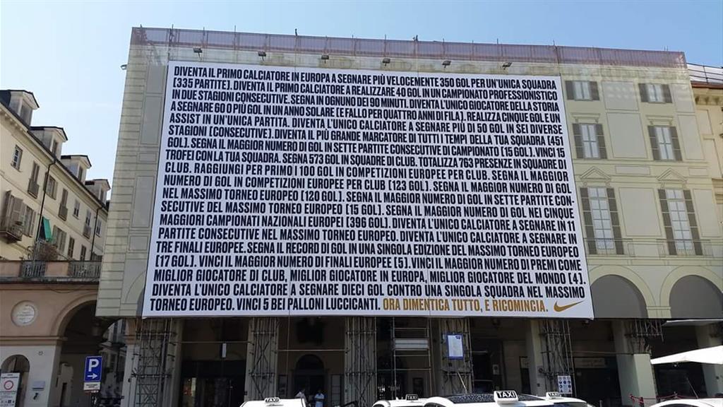 В первом туре чемпионата все ждали дебюта Криштиану Роналду в Италии. Теперь все ждут первого матча португальца на стадионе, который по крайней мере на некоторое время станет для него домашним. Наверное, интерес к поединку против Лацио поклонников "бьянконери" можно было бы и не подогревать дополнительно. И дебют Роналду, и жажда реванша за поражение в прошлом сезоне, да и то, что тифози соскучились по любимой команде, в любом случае гарантировали бы аншлаг. Однако компания NIKE решила напомнить туринцам, кто теперь поселился в их городе, разместив на фасаде одного из домов список достижений и титулов Криштиану, завершив его фразой: "А теперь забудь обо всем этом и начни заново!"