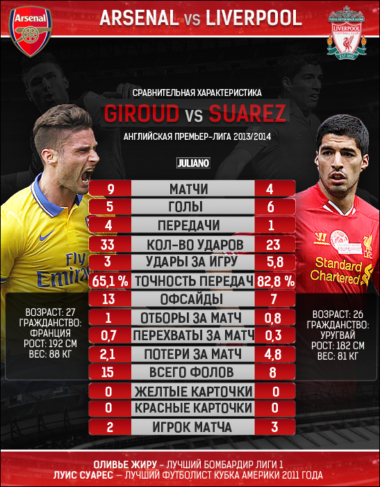 Такова и форма самого Суареса. Вернувшись после дисквалификации, он воссоздал великолепную пару нападающих с Даниэлем Старриджем, эффект которой ощутили на себе практически все соперники Ливерпуля. Красным, тем не менее, сегодня придется противостоять не менее мощной атакующей силе, в которой форвард Оливье Жиру – лишь частичка общей системы. Арсенал имеет в своем распоряжении великолепную, мобильную полузащиту, о противодействии которой, в первую очередь, задумается сегодня Брендан Роджерс.
