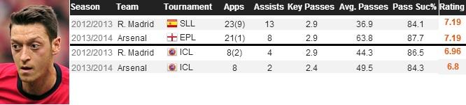 Сейчас Езил делит второе место с Суаресом в чемпионате по количеству передач, направленных под удар/ key passes (2,9). Больше только у Давида Силвы (3.9). По количеству результативных передач наблюдается следующая картина: