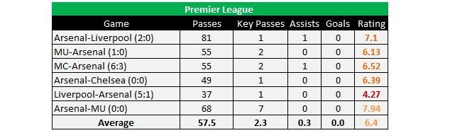 В Арсенале Месут чаще других обостряет игру, и, как следствие, больше всех выполнил результативных передач. Но со средней оценкой, которая равняется 7,19, картина совсем иная – 6-й показатель в команде, и, внимание, 53-й (!) показатель в Премьер-лиге. Как ни парадоксально, а лучший рейтинг на данный момент пока у травмированного Рэмси (7.75) – 8 голов, 6 результативных передач в 18-ти матчах. При этом Аарон чаще других отбирает мяч в команде (3.7 отбора за игру).