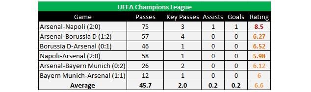 Как видим, все показатели ниже средних по чемпионату. В матчах Лиги чемпионов против Боруссии Дортмунд и Наполи статистика Eзила выглядит следующим образом: