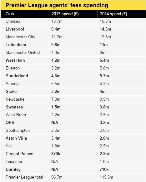Больше всех на агентов потратил Челси – 16,8 миллиона. Сразу за ним – Ливерпуль (14,3), затем Манчестер Сити (12,8) и Тоттенхэм (11).